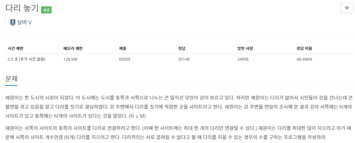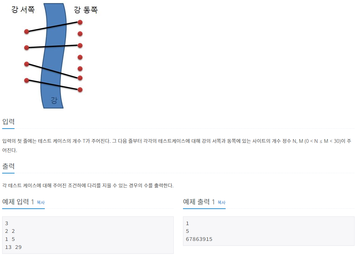 이미 다리를 하나 놓은 경우, N = 1, M = 1 일 경우와 같다.