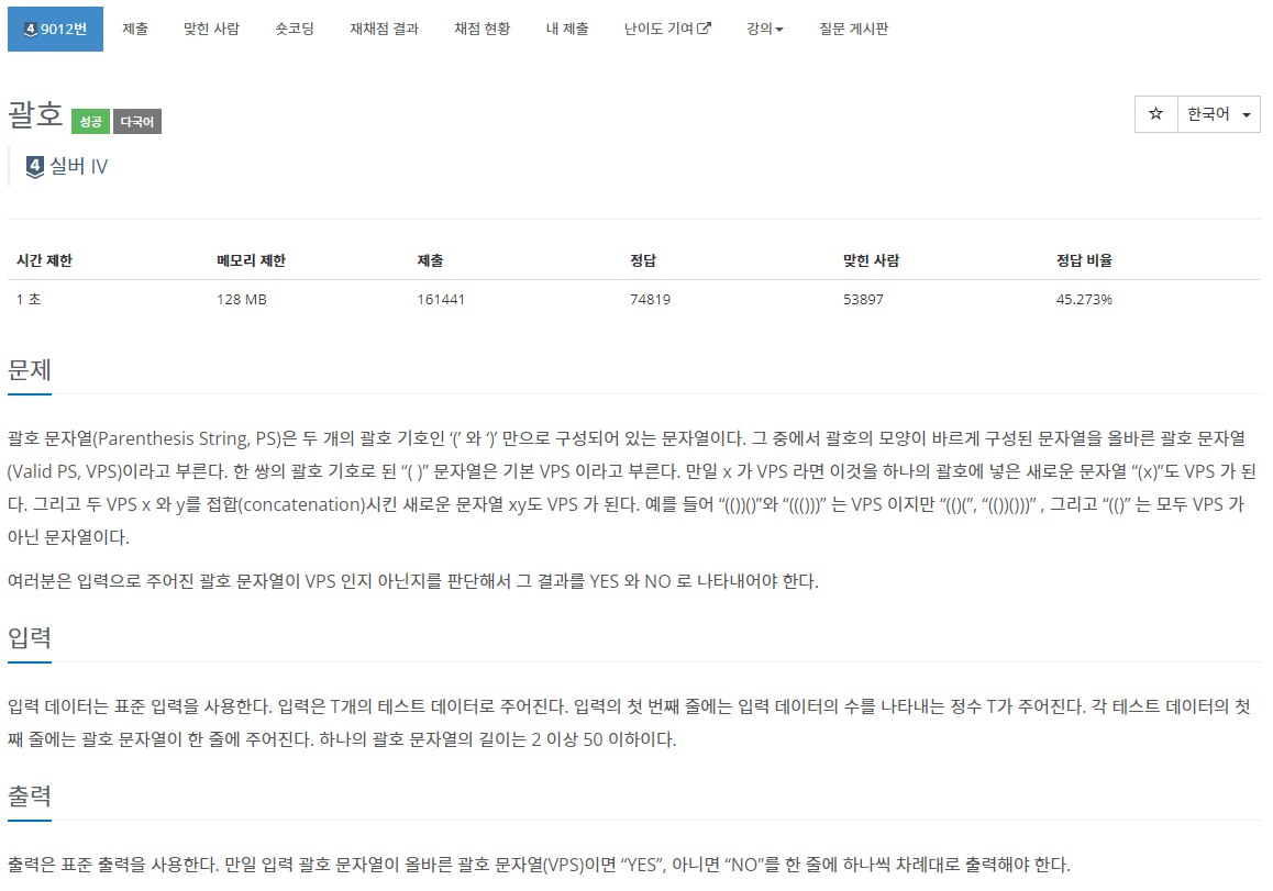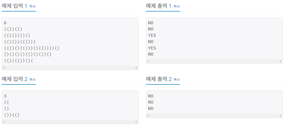 괄호 문자열(Parenthesis String, PS)은 두 개의 괄호 기호인 ‘(’ 와 ‘)’ 만으로 구성되어 있는 문자열이다. 그 중에서 괄호의 모양이 바르게 구성된 문자열을 올바른 괄호 문자열(Valid PS, VPS)이라고