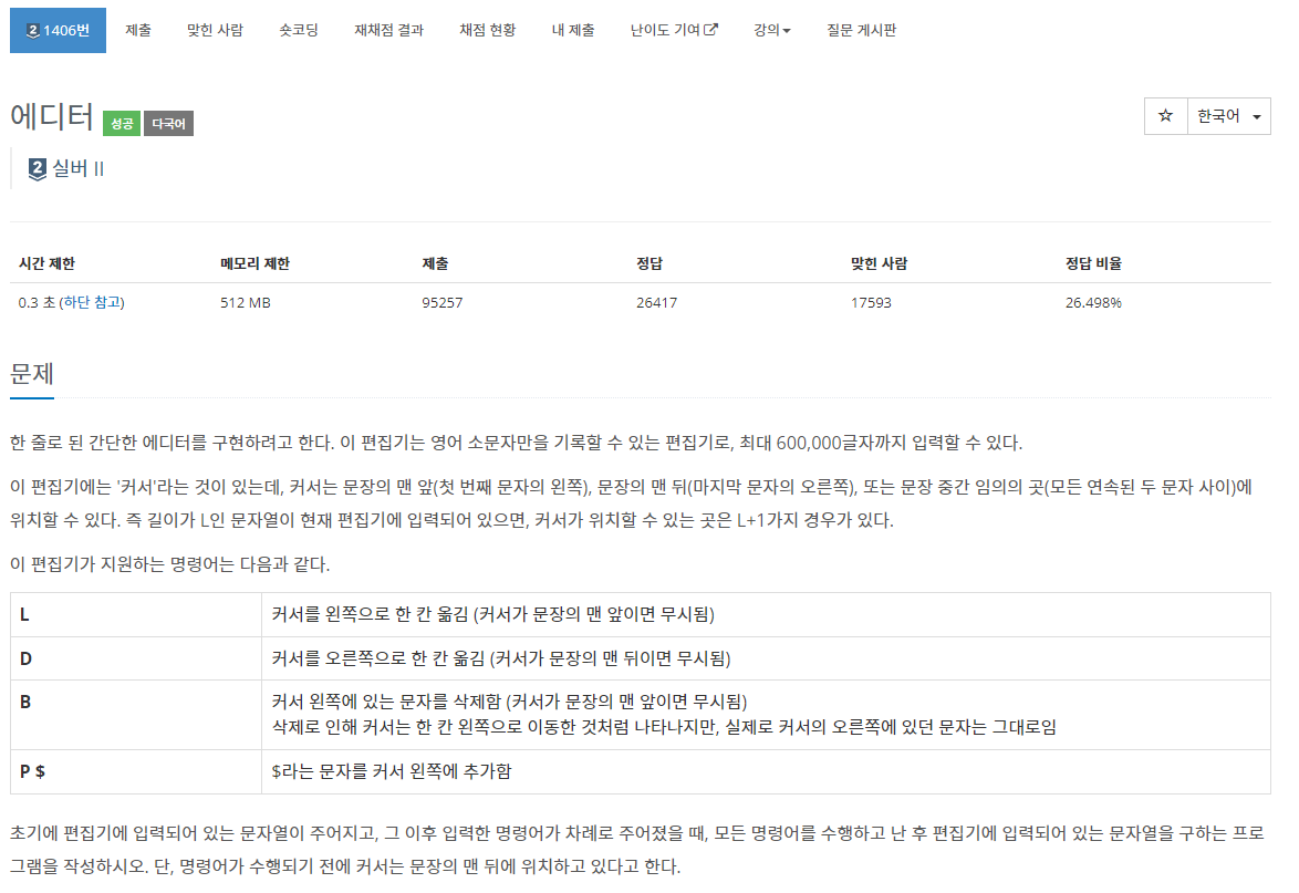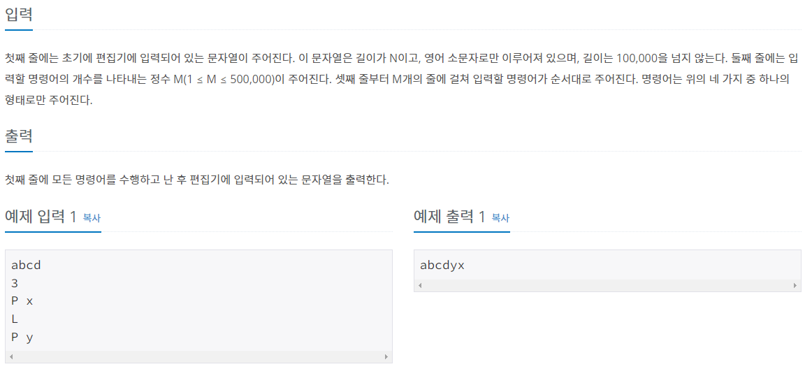 첫째 줄에는 초기에 편집기에 입력되어 있는 문자열이 주어진다. 이 문자열은 길이가 N이고, 영어 소문자로만 이루어져 있으며, 길이는 100,000을 넘지 않는다. 둘째 줄에는 입력할 명령어의 개수
